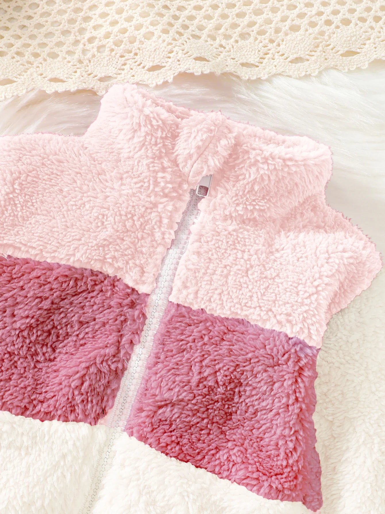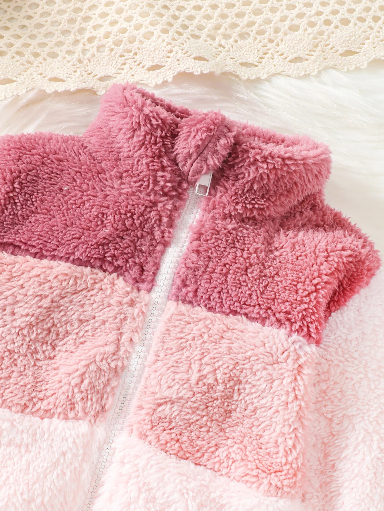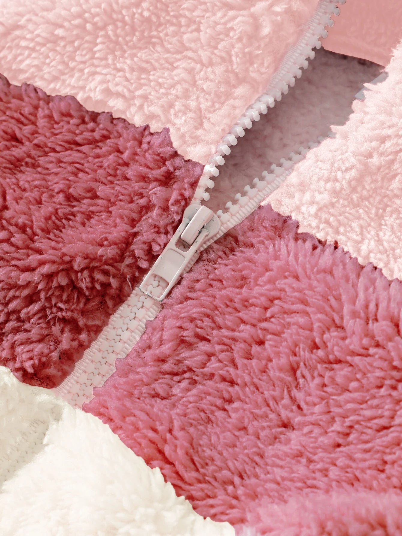 2-8 Years Kids Girl Plush Overcoat Long Sleeves Lapel Zippered Coat for Winter Outdoor Wear Fashion Color Blocking Warm Top