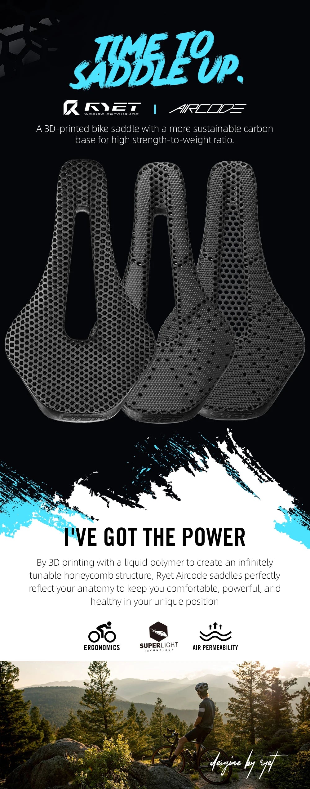 It is RYET's premium lightweight carbon saddlecombining the unique possibilities of 3Dprinting with the extreme qualitiesof carbon fibre.