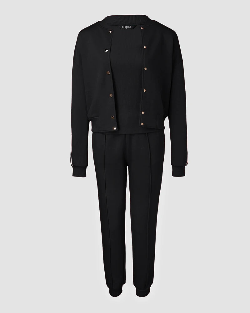 Inspired by Fall/Winter Athleisure Trends, this 3PCS Co-ords Set featured a Baseball Jacket,a racerback tank and joggers, comfort and style, perfect for this season.
