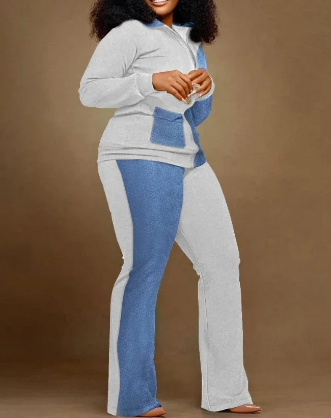 CPSYMYM Two Piece Set Women Outfit Autumn Denim Look Print Zipper Design Stand Collar Long Sleeve Top & Casual Pants Set