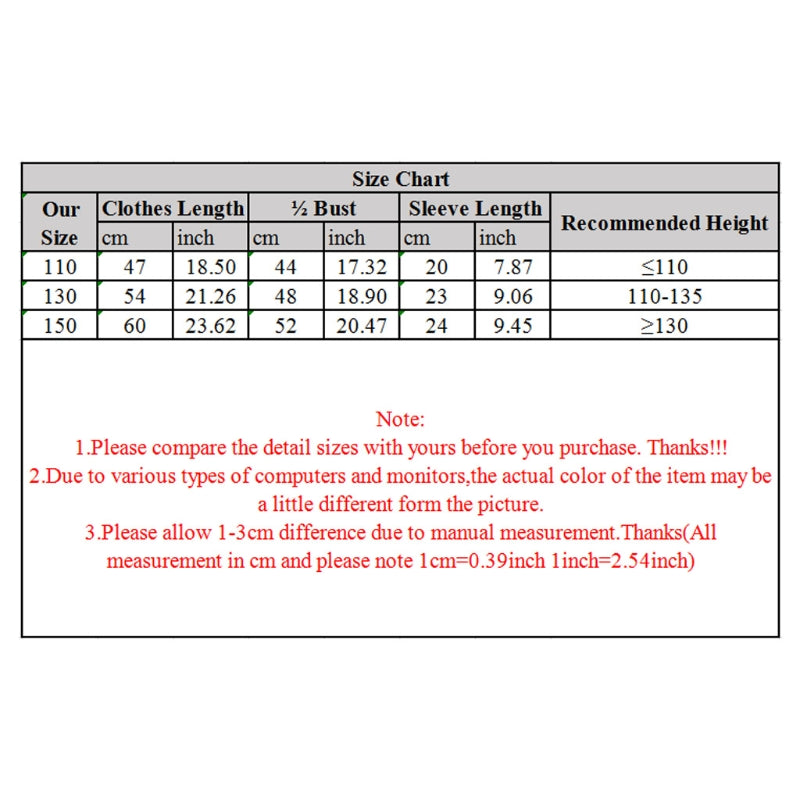 Size:130 Clothes Length:54cm(21.26inch) Bust:48cm(18.90inch) Sleeve Length:23cm(9.06inch) Recommended Height:110-135