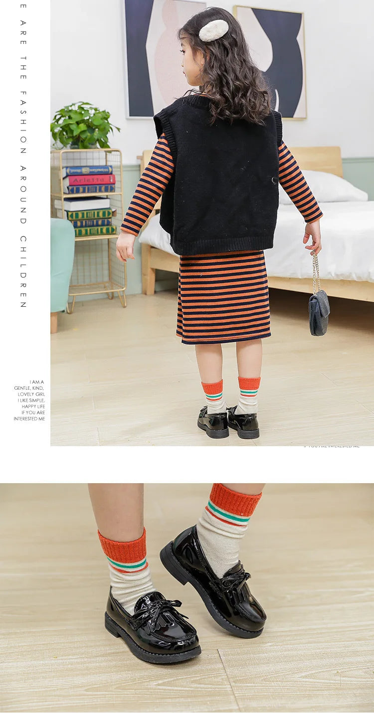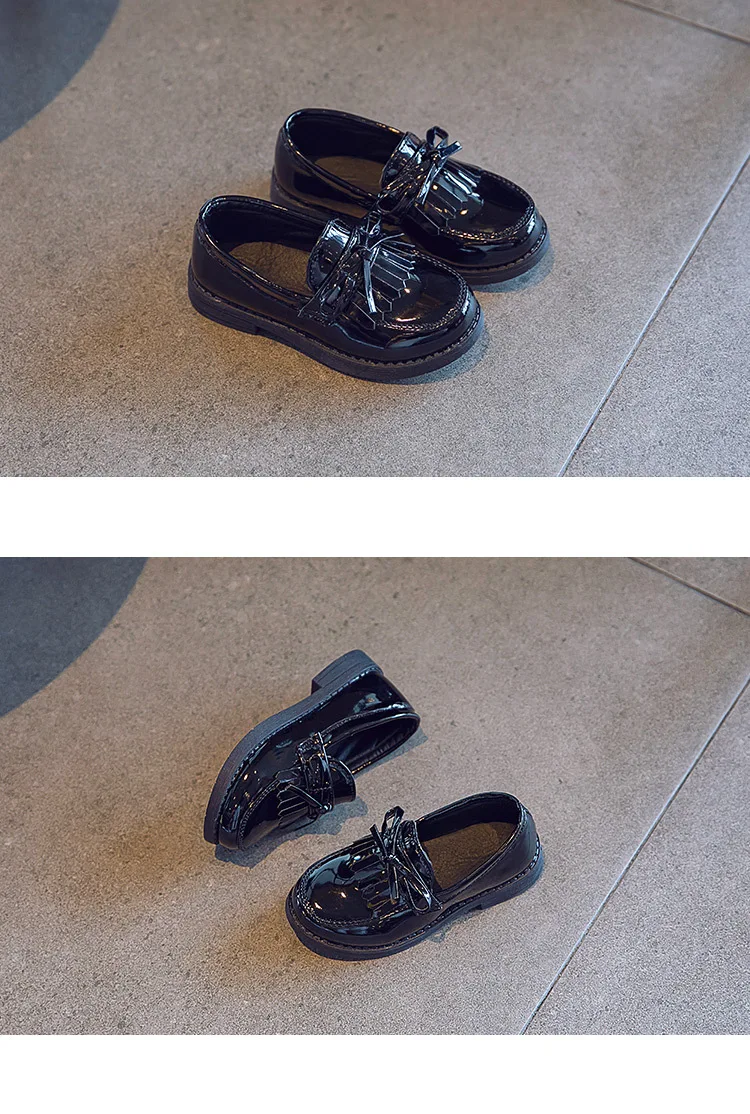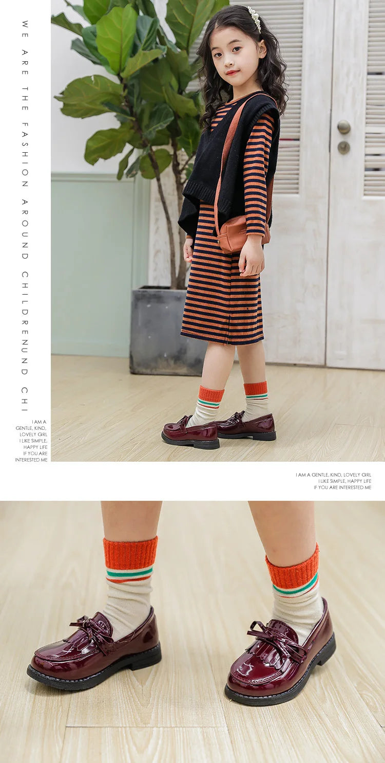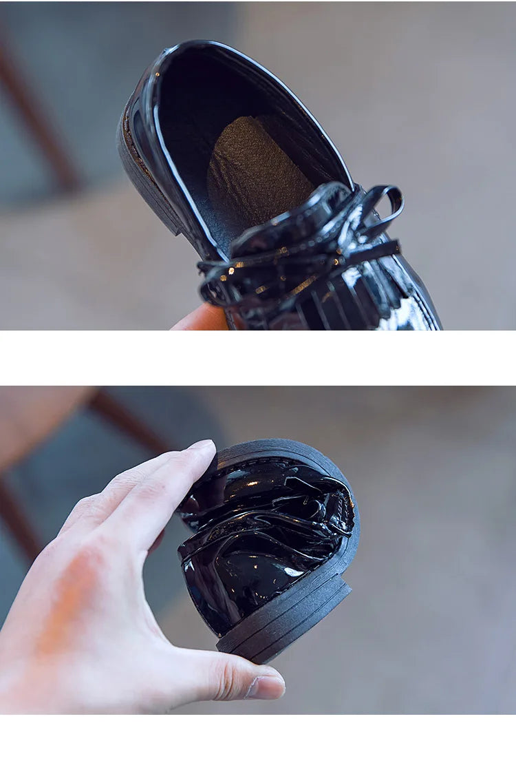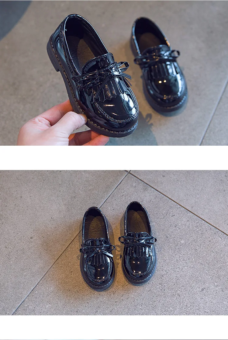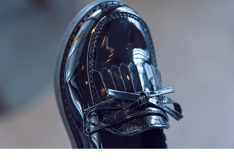 Girls Casual Leather Shoes Kids Flats Tassels with Bow-knot British Style Soft Slip-on Loafers for Wedding Party Bright Skin New