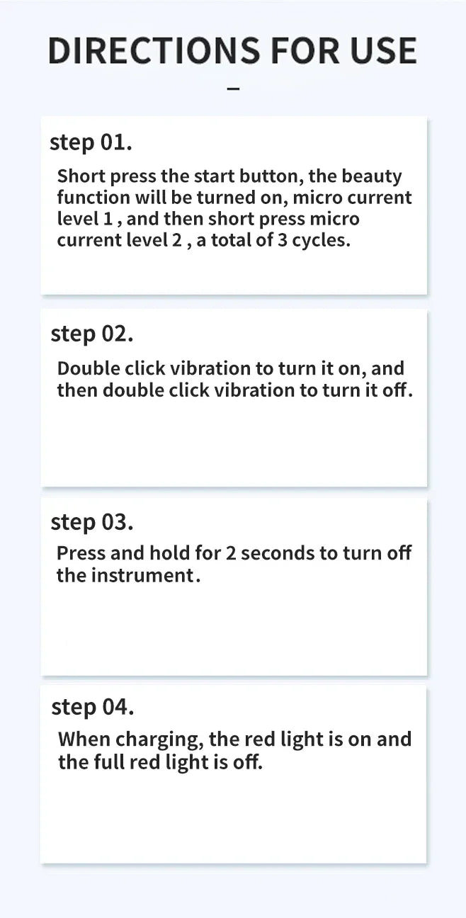 Usage : 1. Short press the power button to turn on the beauty function, with the first level of micro current, and then short press the second level of micro current, for a total of three cycles.