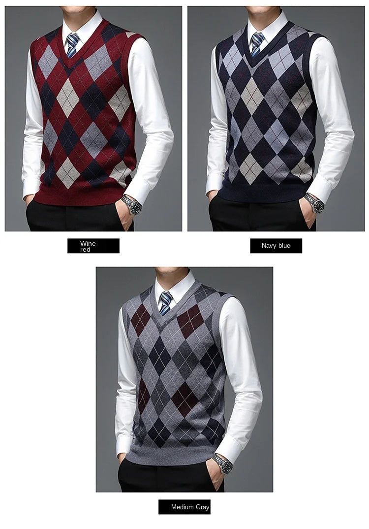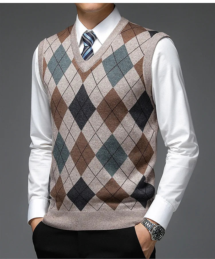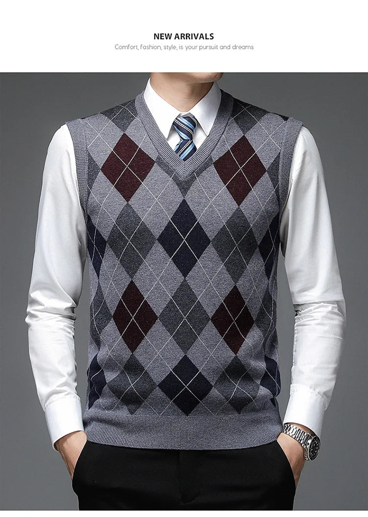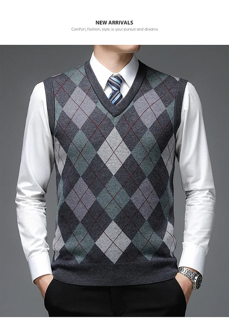 New Autum Fashion Designer Brand Argyle Pullover Diamond Sweater V Neck Knit Vest Men 6% Wool Sleeveless Casual Men Clothing