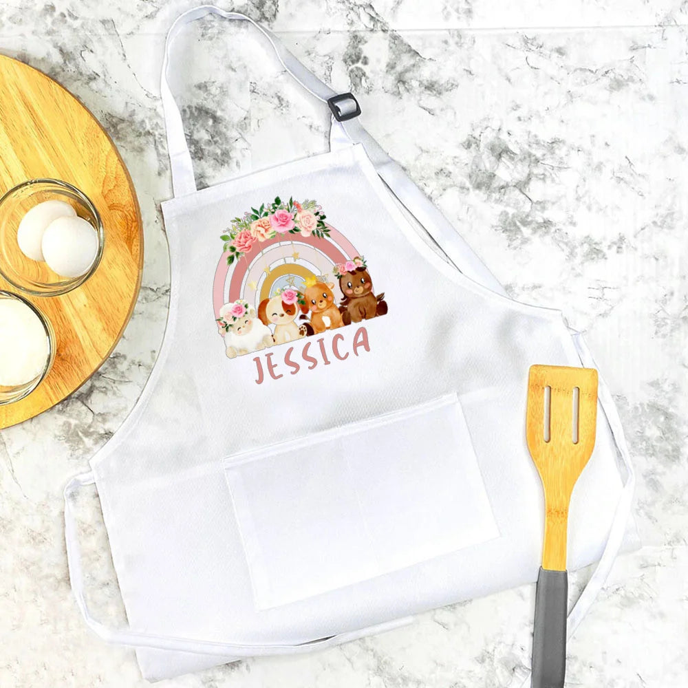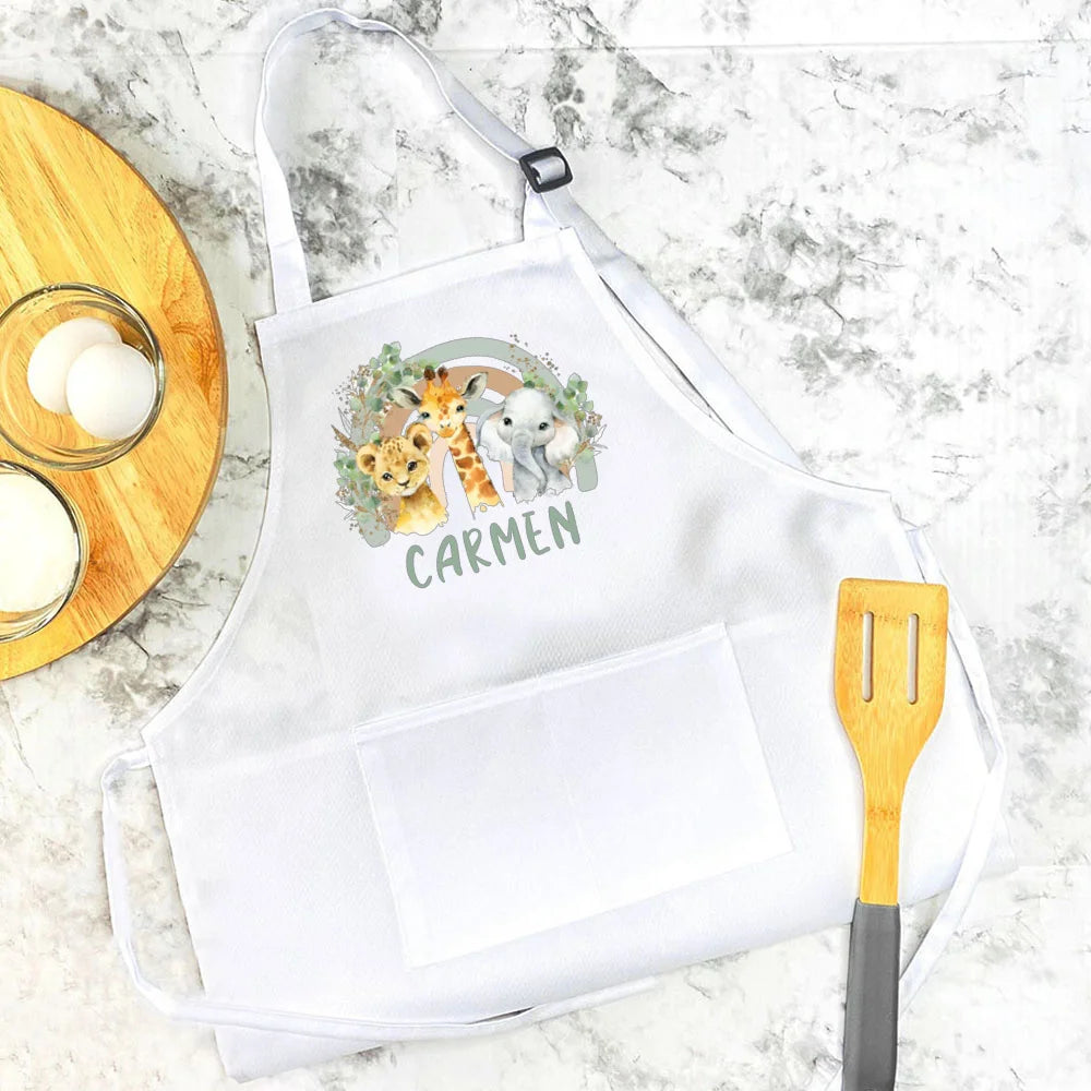 Personalised Child Apron Rainbow Safari Animals with Name Apron Boys Girls Cooking Baking Apron Custom Birthday Gift for Kids