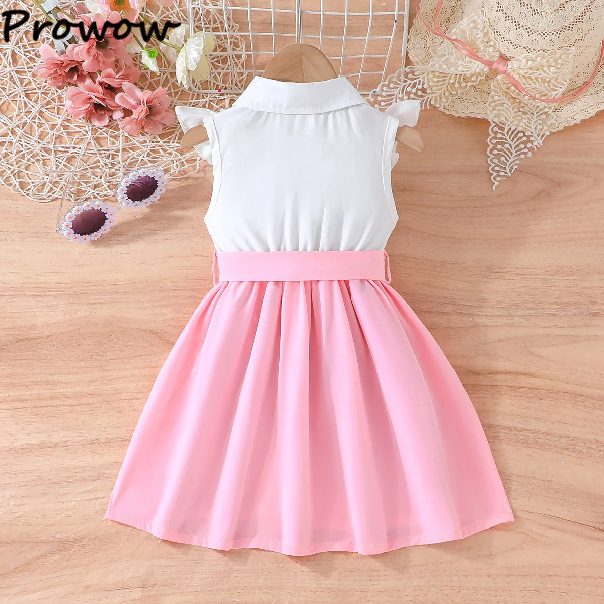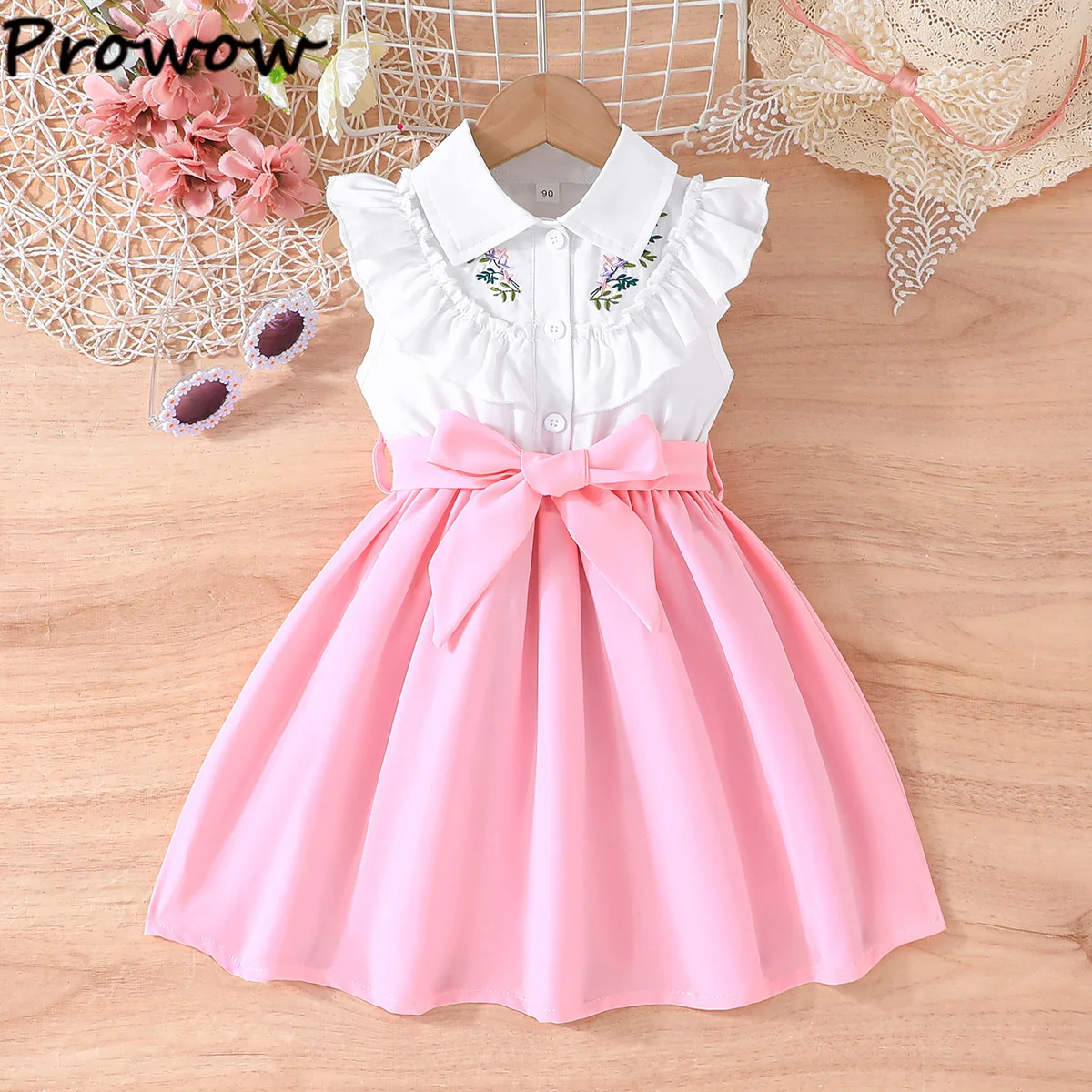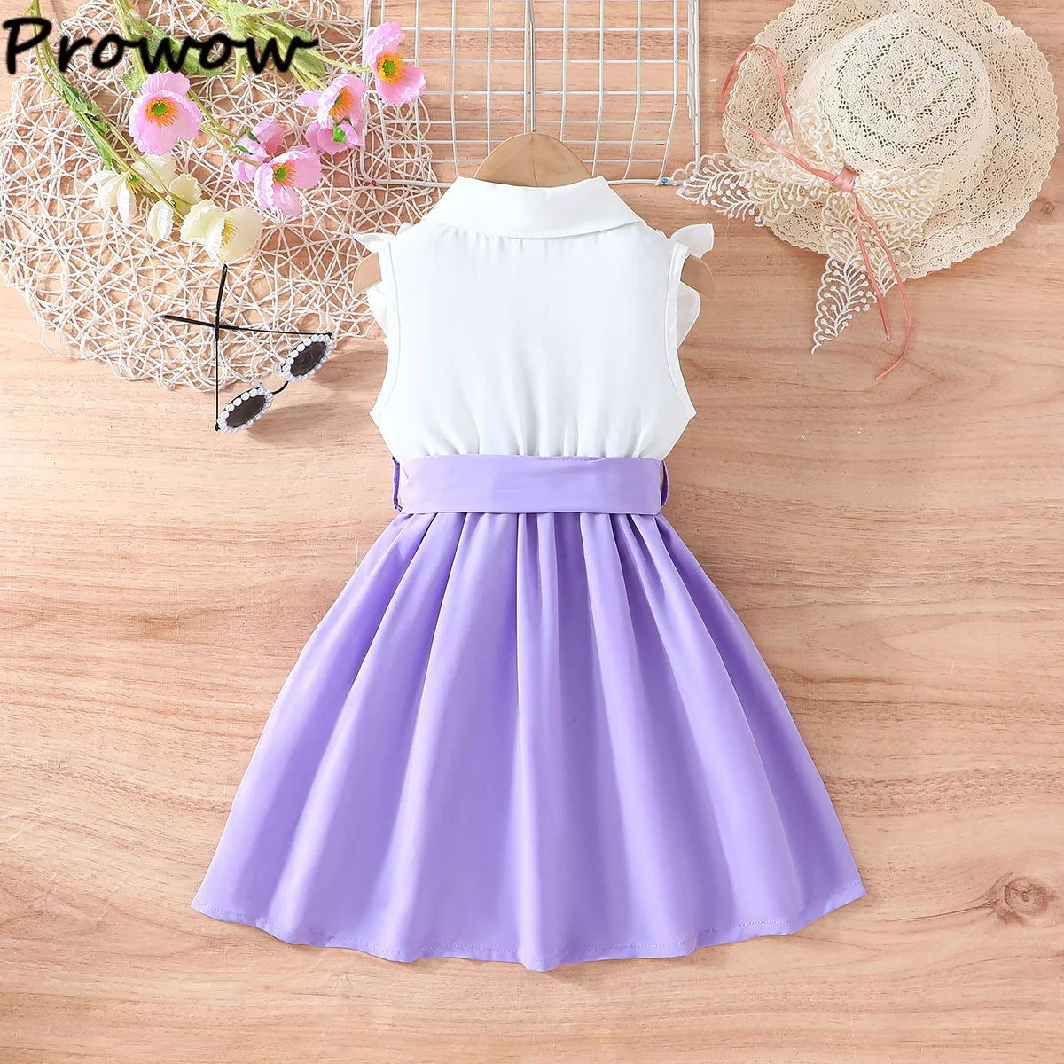 Prowow Lady Girl's Dresses Sleeveless Embroidery Floral Lotus Dress Turn-Down Collar Patchwork Shirt Dress For Girls With Belt