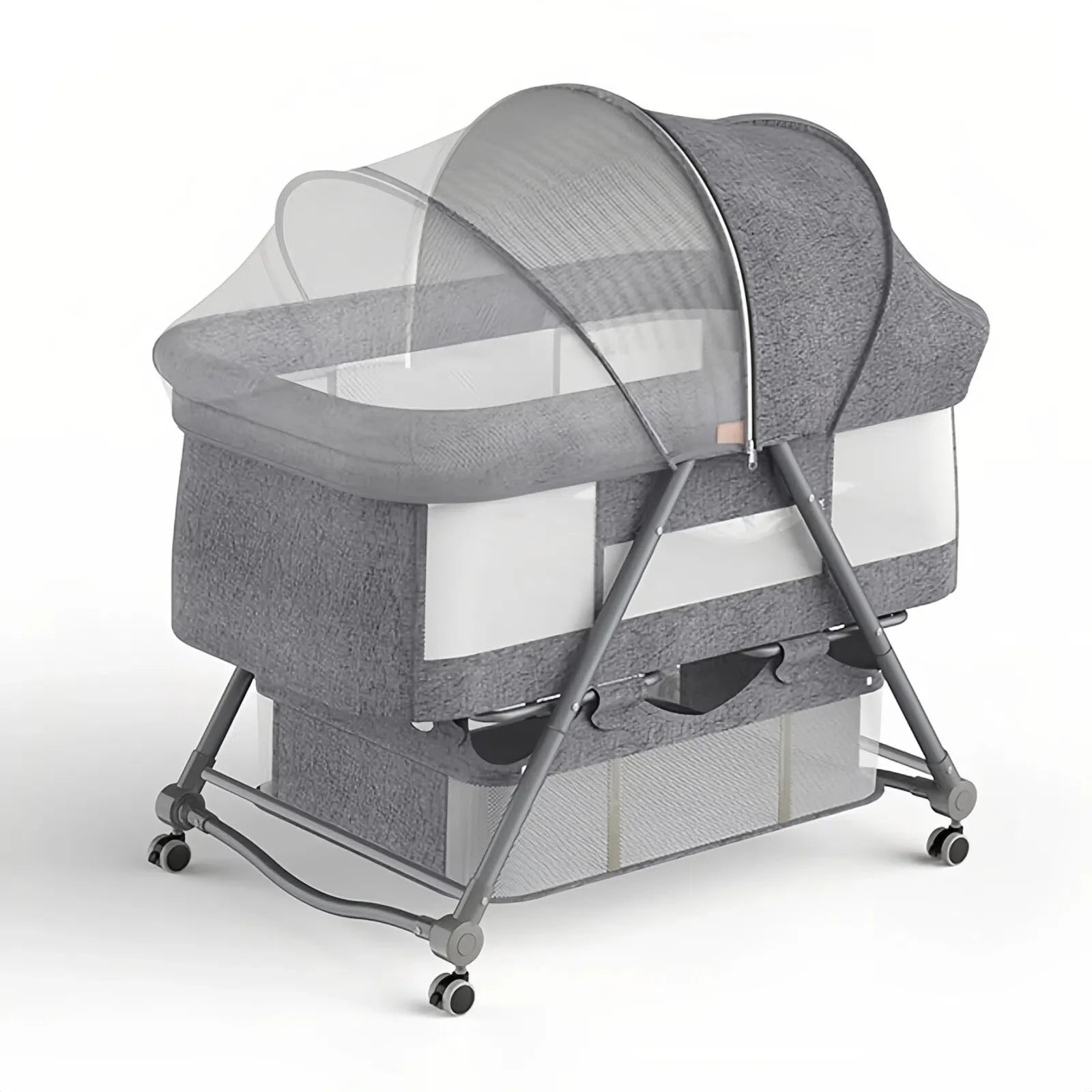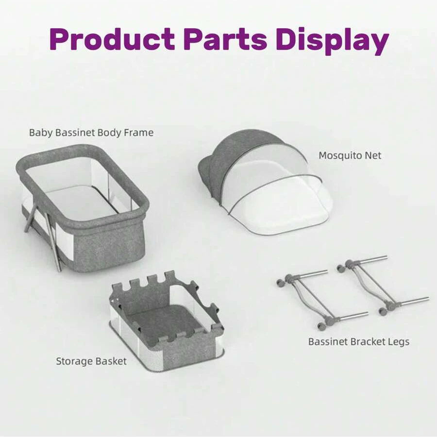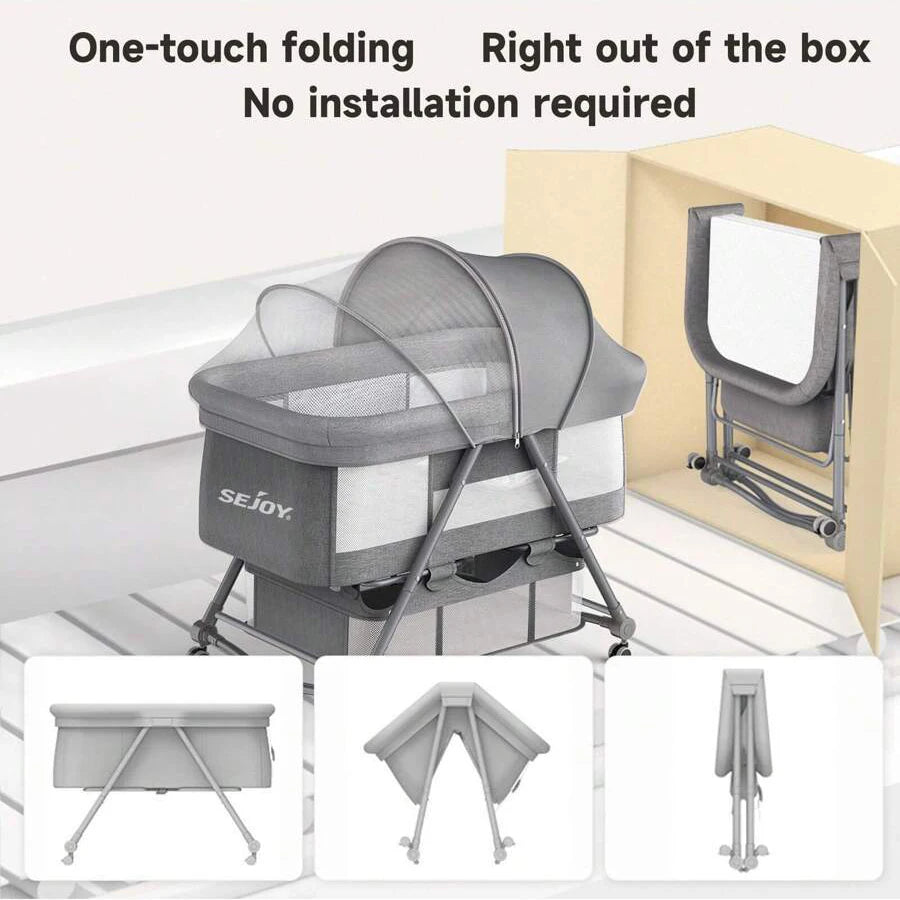 Quick no-tool setup, foldable, 20KG load, storage basket, rocking mode, lockable wheels for home/travel.Adjustable Mattress & Comfort