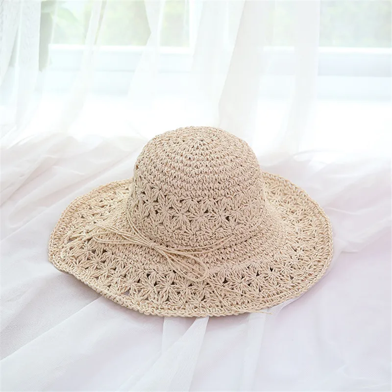 Feature: Sun protection,Women Floppy Hollow Straw Bucket Hat With String Bow