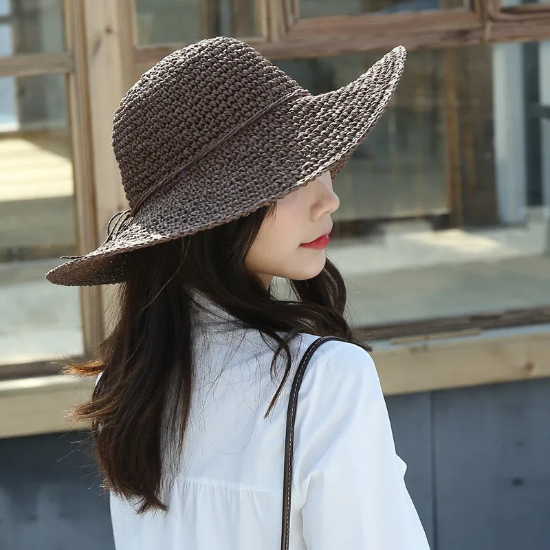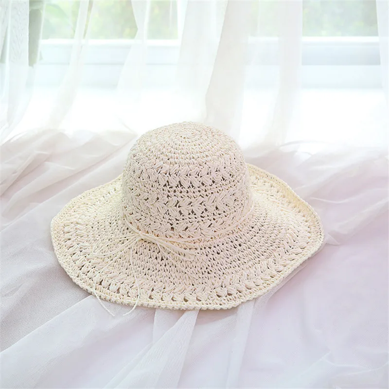 Summer Women Floppy Breath Straw Beach Bucket Hat With String Bow Wide Floppy Brim Fishing Hats UV Sun Protection Caps