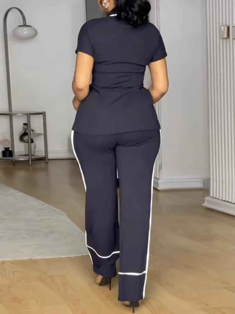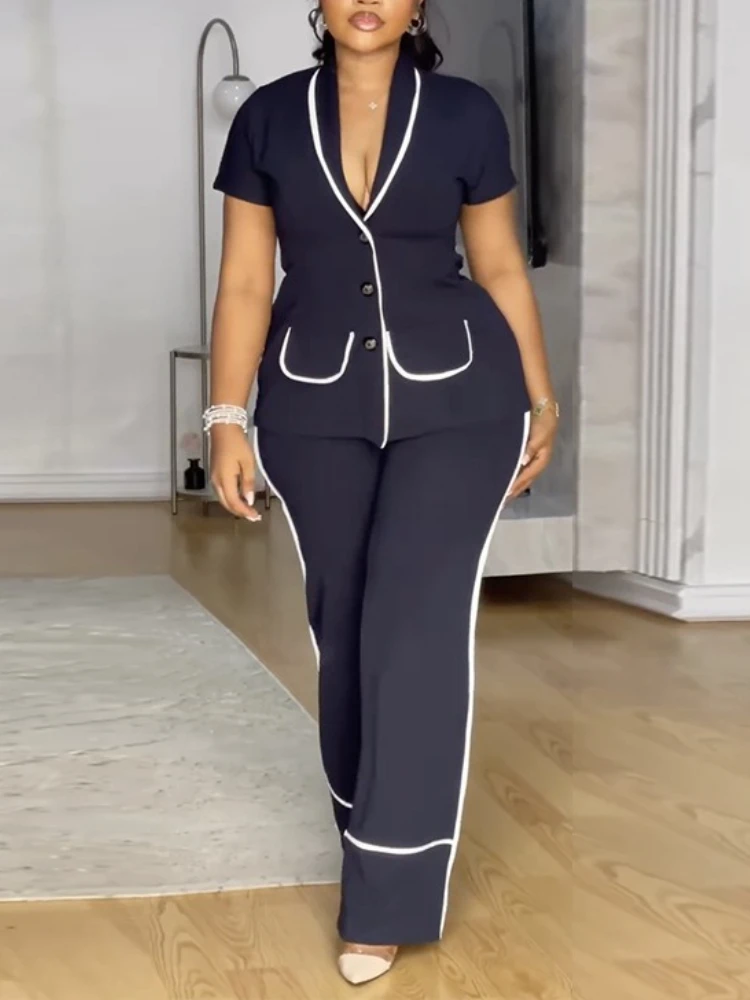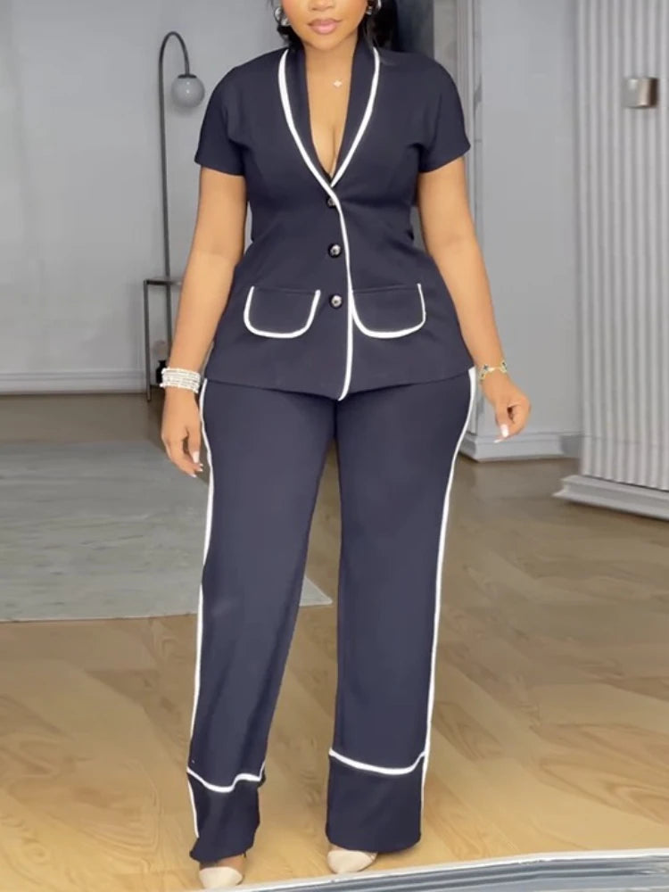 Two Piece Sets Women Outfits Short Sleeve Button Blazer Straight Pants Set with Contrast Piping Perfect for Office Wear Business