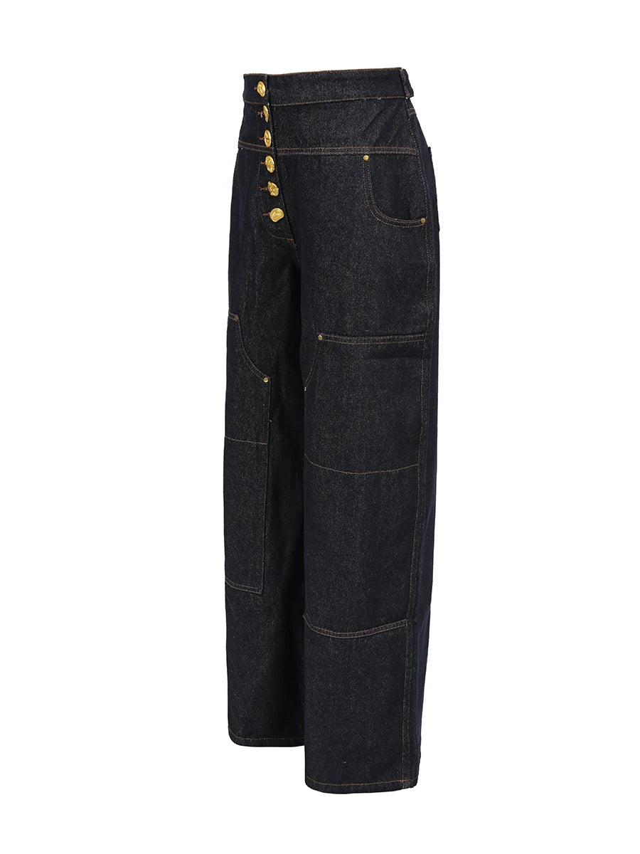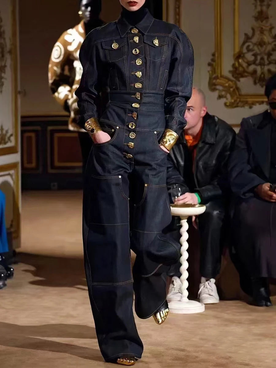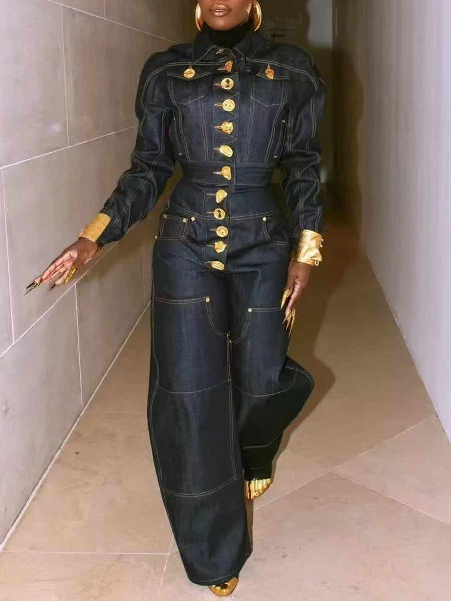 TWOTWINSTYLE Spliced Button Two Piece Sets For Women Lapel Long Sleeve Top High Waist Patchwork Pockets Pant Set Female Fashion