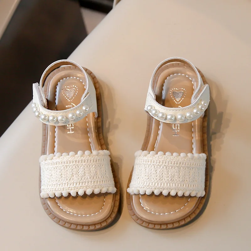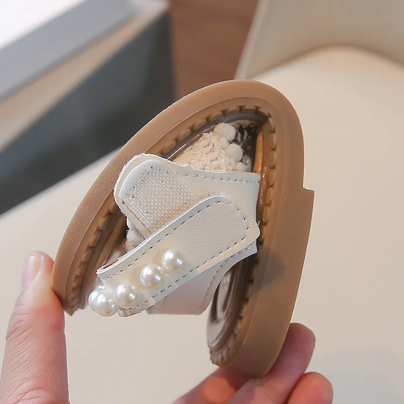 Unishuni Girls Sandals Princess One-Strap Summer Shoes Child Soft Skin-Friendly Cloth Sandal Kids Lace Pearl Bohemia Beach Flats