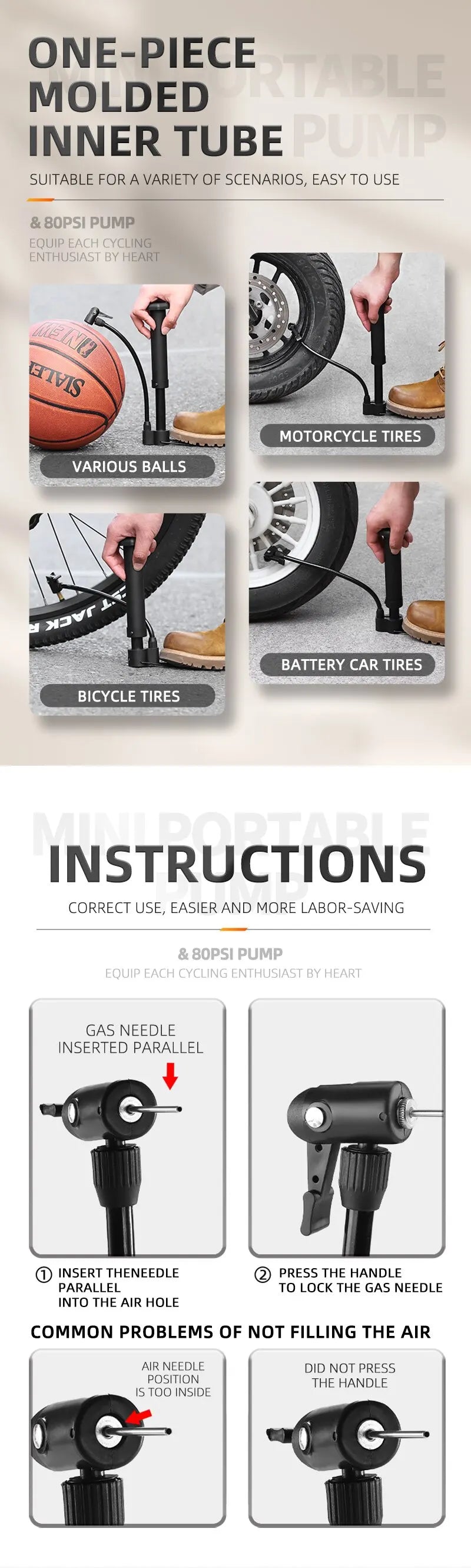 • 80 PSI Bike Manual Air Pump :The pump can inflate your bike tires up to 80 PSI, ensuring that you have the right amount of air pressure for a smooth ride.