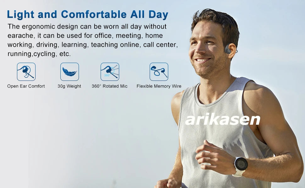 Open ear headphones wireless Bluetooth with microphone has IPX5 rated waterproof, it's perfect for people who love sports, running, biking, hiking, skiing, snowboarding, working out! Bluetooth headset with noise cancelling mic is the best partner for office, conference, truck driver, online teaching/learning, call center, home work. (Note: It only protects against small amounts of sweat and rain and is not recommended for swimming!)